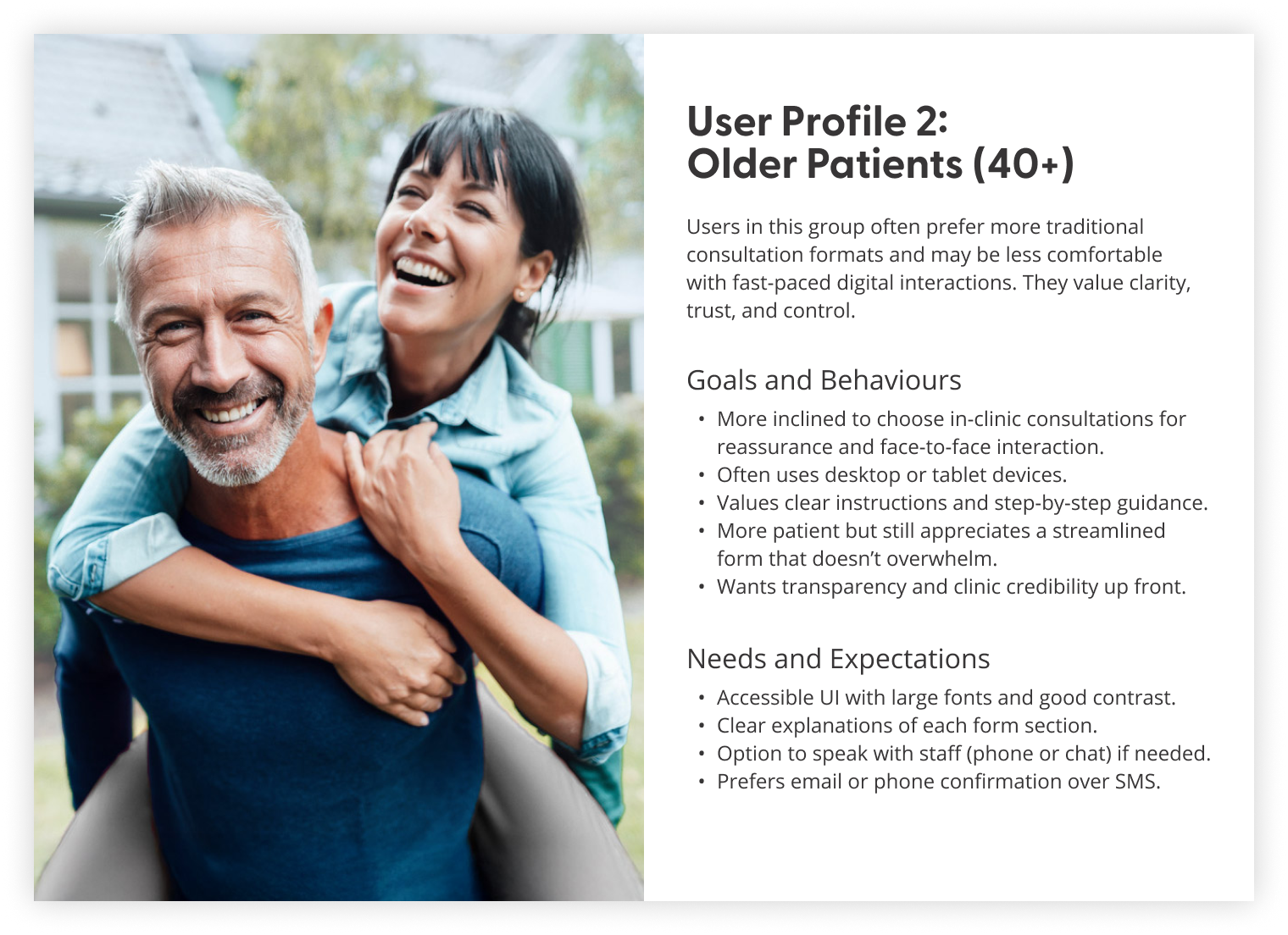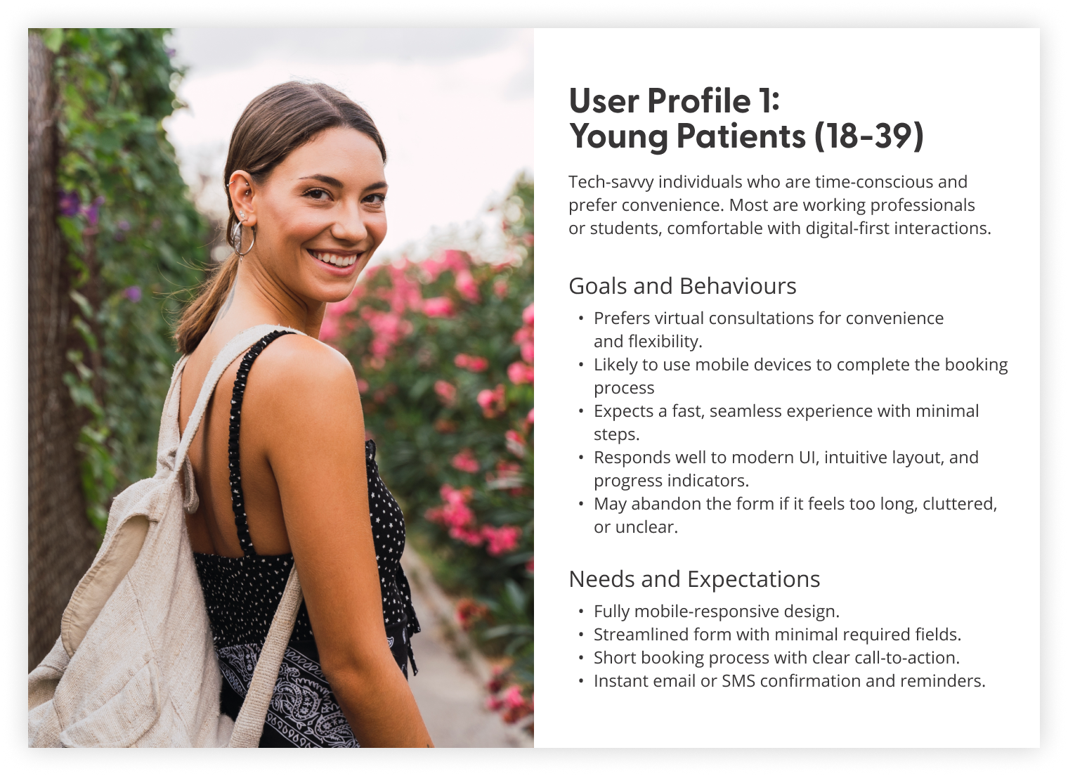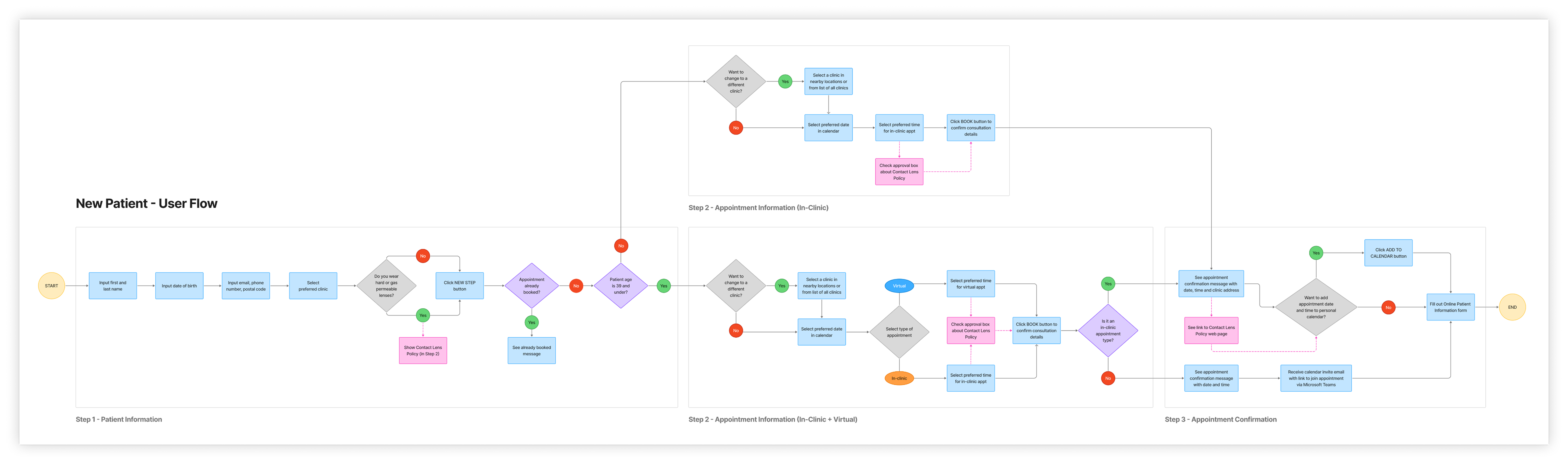 Following that, we mapped the new patient’s booking flow to gain a clear understanding of the redesigned process and ensure alignment with business objectives. Incorporating a user scenario and job story validated that the flow effectively met user needs.