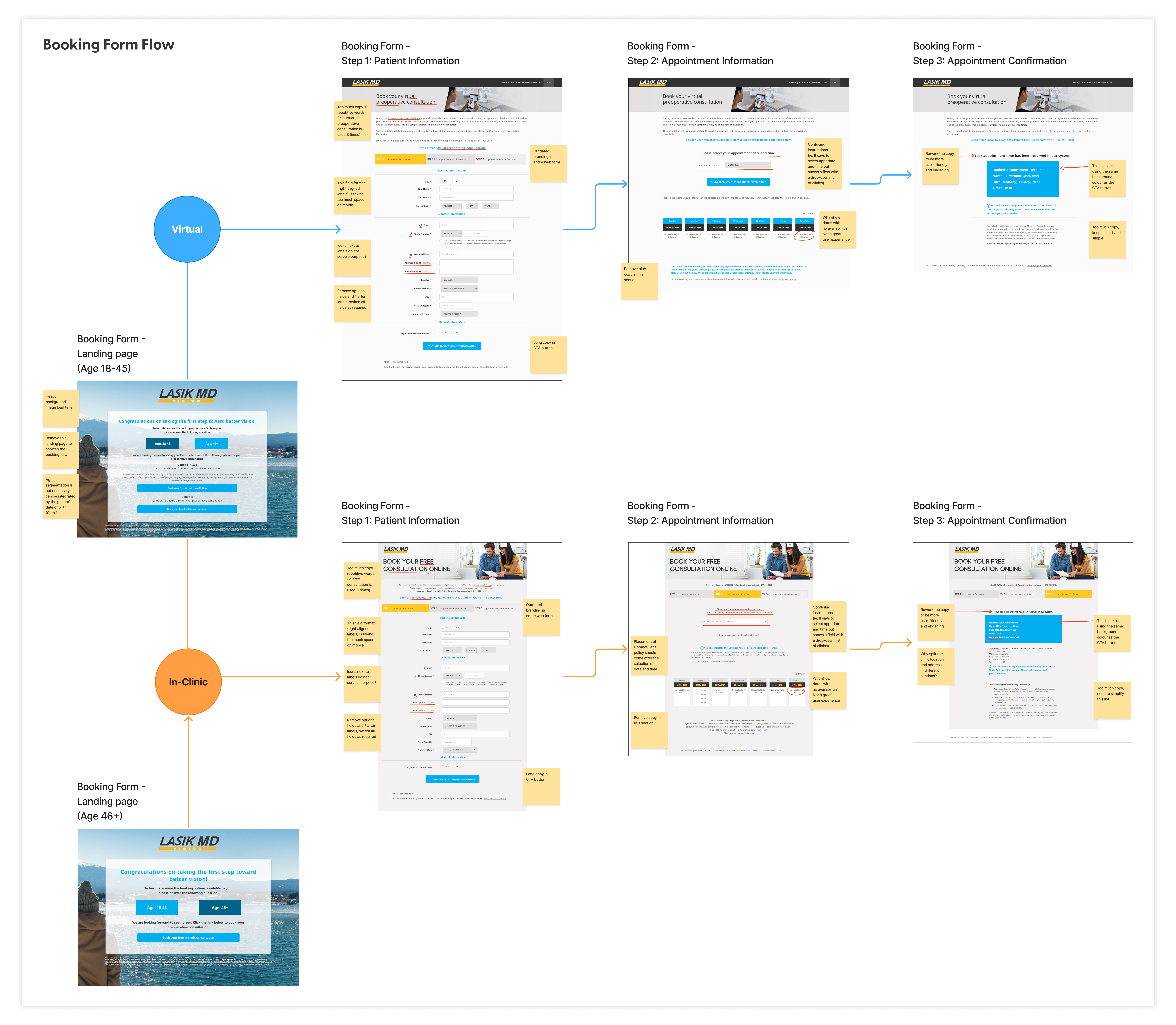 We began with a booking form audit to understand why users were struggling. From a new patient’s perspective, the confusing layout and lack of clear visual cues made navigation frustrating—especially on mobile. On top of that, separating patients by age into different virtual or in‑clinic forms added unnecessary complexity, leaving new patients feeling unsure and slowing down the booking process. Other noticeable pain points—such as heavy image load times and a confusing date and time picker that displayed unavailable options—further contributed to a discouraging and inefficient user experience.