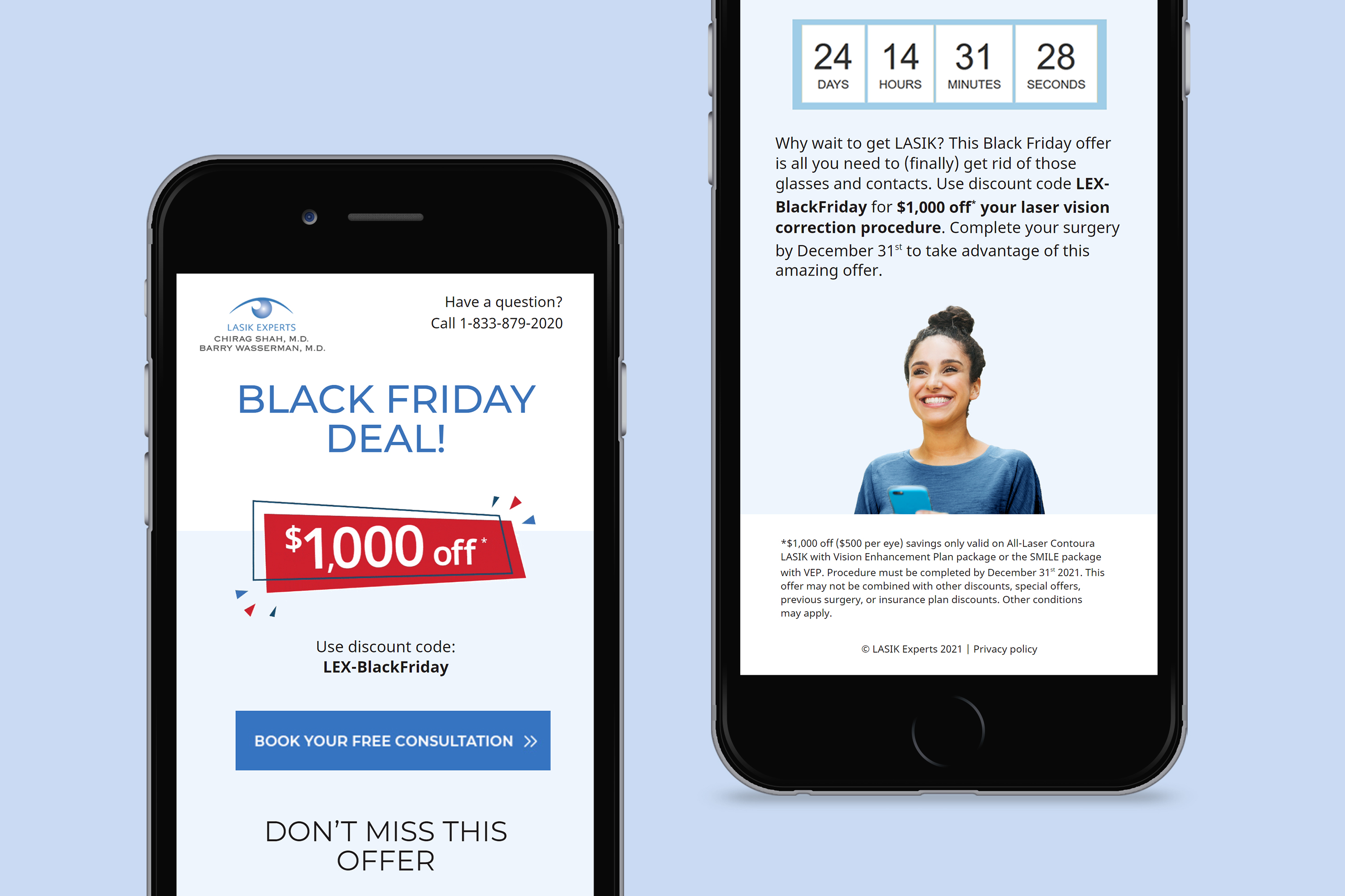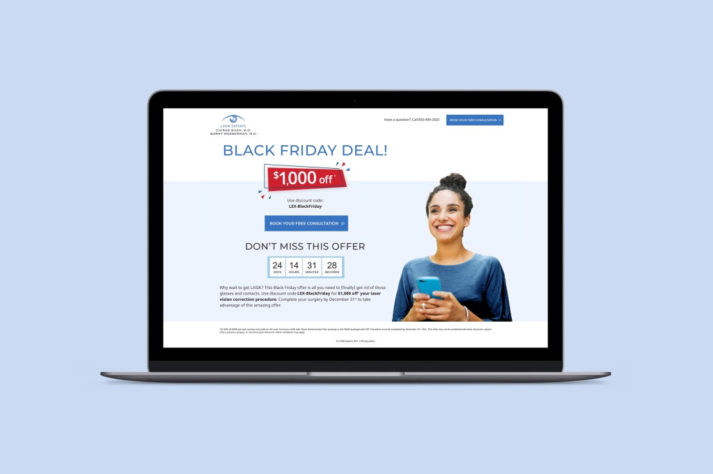 Designed and integrated a landing page for LASIK Experts’ Black Friday campaign using a responsive layout. The landing page includes a discount code that was available for a limited time, ending on the date set in the countdown timer using Javascript.