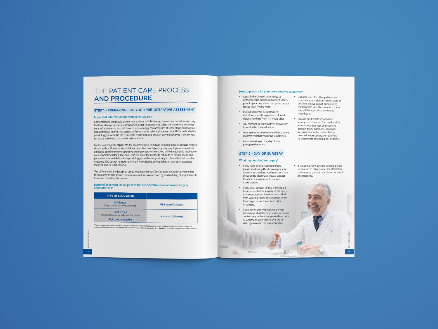 Created a 32‑page information booklet about lens replacement procedures for custom vision correction offered at TLC Laser Eye Centres. The booklet provides a detailed explanation of the vision correction procedures and technology, the benefits and potential complications, as well as the patient care process.